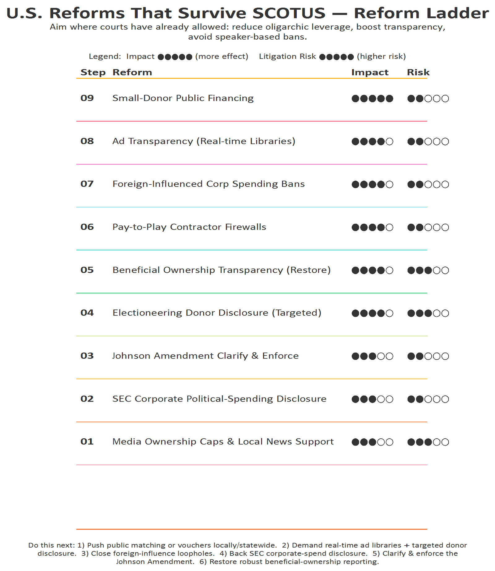 1) Small-donor public financing (NYC/Seattle models)